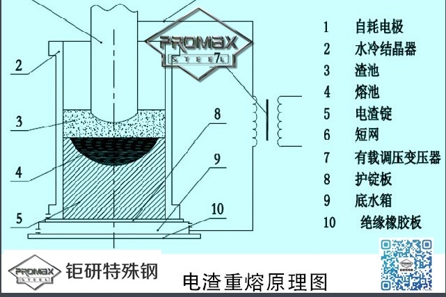 同時,液態(tài)金屬在渣池覆蓋下,基本上避免了再氧化。因為是在銅制水冷結(jié)晶器內(nèi)熔化、精煉、凝固的,這就杜絕了耐火材料對鋼的污染。鋼錠凝固前,在它的上端有金屬熔池和渣池,起保溫和補縮作用,保證鋼錠的致密性。上升的渣池在結(jié)晶器內(nèi)壁上形成一層薄渣殼,不僅使鋼錠表面光潔,還起絕緣和隔熱作用,使更多的熱量向下部傳導(dǎo),有利于鋼錠自下而上的定向結(jié)晶。